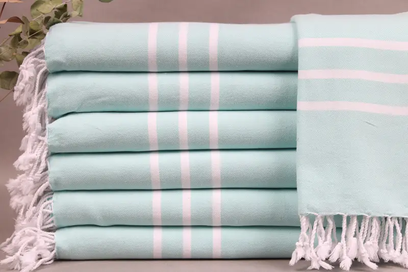 The Turkish Towels are woven from organic Turkish cotton, ensuring high absorbency and durability. Characterized by dimensions of 40x71 inches or 100x180 centimeters, the weight of each towel is 430 grams. Weaving tolerances of ± 2 inches or 5 centimeters are expected.