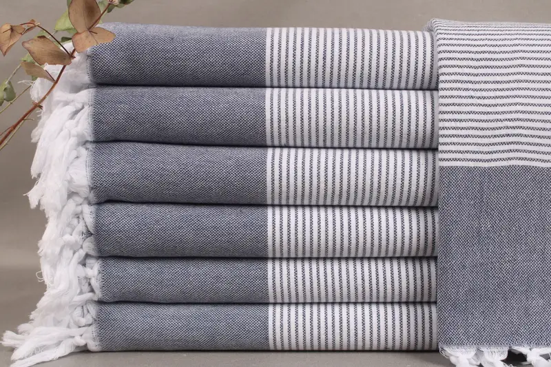 All Turkish towels and related products are woven from organic Turkish cotton, ensuring quality and sustainability. These products, resulting in high absorbency, measure 40x71 inches or 100x180 centimeters, weighing approximately 300 grams. A hand-weaving tolerance of ±2 inches or 5 centimeters is standard.