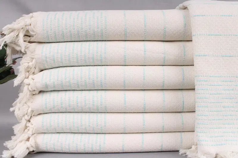 Fiber composition ensures these Turkish Throw Blankets are exceptionally soft, characterized by their high absorbency due to the organic Turkish cotton used. Dimensions provide versatility, as each blanket measures 91x97 inches or 230x245 centimeters, with a weight of 1220 grams. Weaving tolerances allow for a size variation of ± 2 inches or 5 centimeters.