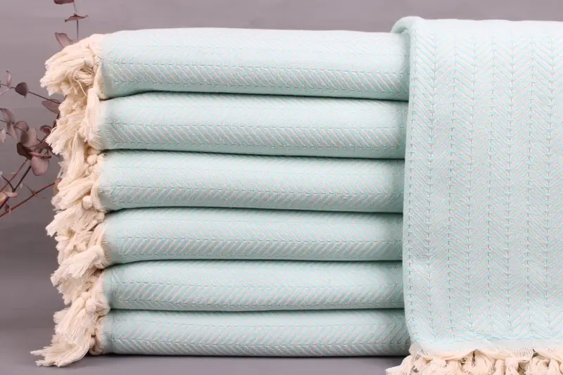 Woven from organic Turkish cotton, each blanket is handmade on looms, ensuring superior quality. Measuring 75x91 inches or 190x230 centimeters, these blankets weigh 1150 grams. The weaving process results in a tolerance of ±2 inches or 5 centimeters.
