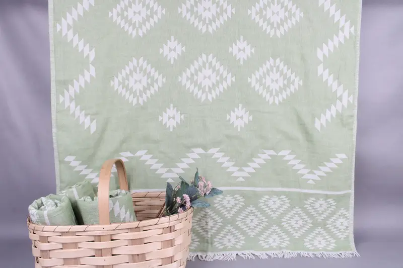 All beach towels, small towels, and throws are woven from organic Turkish cotton on looms, ensuring high-quality and hand-crafted finish. Characterized by dimensions of 36x71 inches or 90x180 centimeters and a weight of 320 grams, these items exhibit hand-weaving tolerances of ±2 inches or 5 cm.