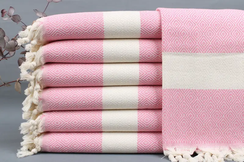 Fiber composition includes organic Turkish cotton, ensuring high quality and absorbency. Each towel measures 20x36 inches (50x90 centimeters) with a tolerance of ±2 inches (5 centimeters) and weighs 115 grams. Hand-woven on looms, the products offer customizable embroidery with letters, names, or logos, featuring a recommended placement at the middle of the bottom.