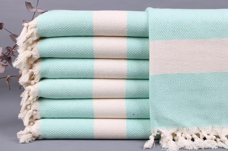Turkish Towels are woven from organic Turkish cotton ensuring durability and softness. Characterized by their 20x36 inches (50x90 cm) dimensions and 115 grams weight, these towels exhibit a hand-weaving tolerance of ± 2 inches or 5 cm. Embroidery customization is available for personalization with letters, names, or logos.