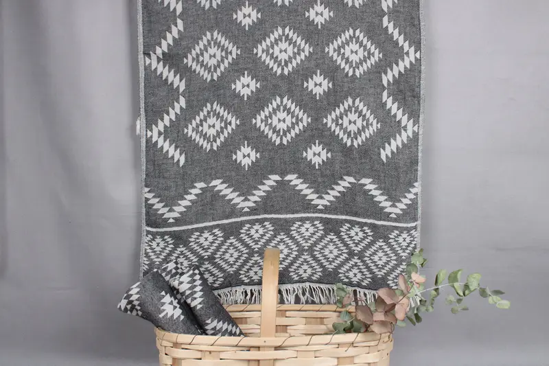 Characterized by its organic Turkish cotton composition, the towels exhibit robust absorbency and durability. Resulting from meticulous hand-weaving on traditional looms, the towels measure precisely 18x40 inches or 45x100 centimeters, weighing 130 grams. Expect size variations within a ± 2-inch or 5cm tolerance due to the hand-weaving process.