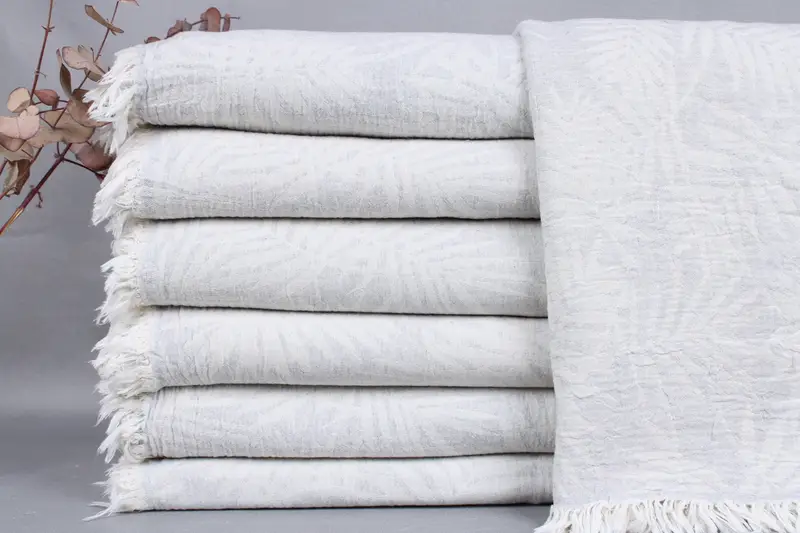 Fiber composition ensuring high absorbency, Turkish organic cotton ensures the blankets and towels are highly absorbent and durable. Characterized by a hand-weaving process, these items measure 79x99 inches or 200x250 centimeters, providing a substantial coverage area. There is a tolerance of ±2 inches or 5 cm due to weaving, and the weight is 1000 grams.