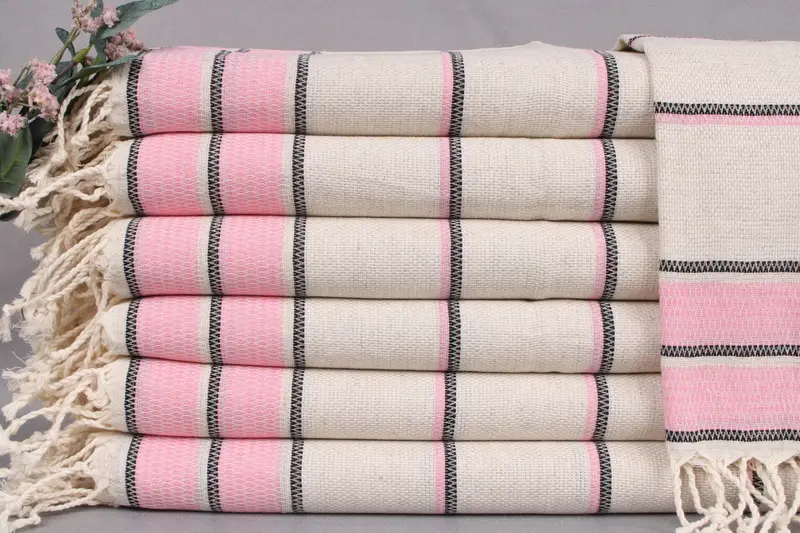 Organic Turkish cotton provides an exceptional quality, characterized by its softness and high absorbency. Each hand towel, measuring 20x40 inches or 50x100 centimeters, and weighing 120 grams, ensures durability and comfort. Tolerances of ± 2 inches or 5 centimeters in dimensions are expected due to the hand-weaving process.