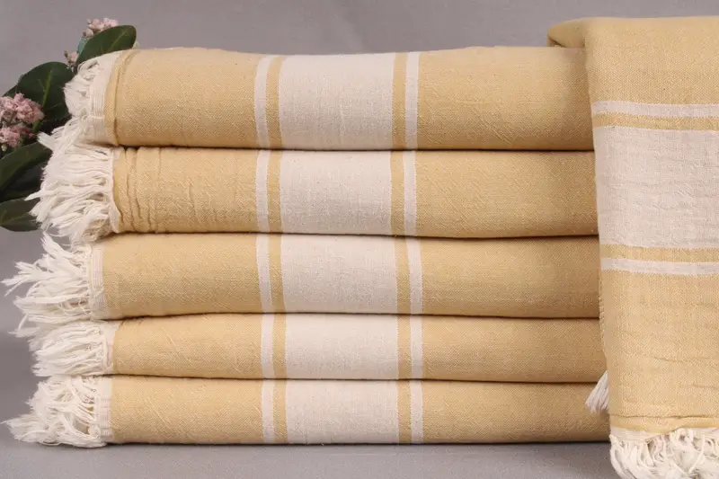 Organic Turkish cotton blankets, ensuring high absorbency and luxurious softness. Resulting in a balanced combination of durability and comfort, these products are characterized by their hand-woven construction. Each blanket, measuring 60x71 inches (150x180 cm), weighs approximately 520 grams, with a tolerance of ±2 inches or 5 cm due to the weaving process.