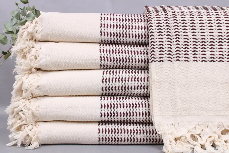 Turkish bedspreads and blankets are characterized by their high absorbency, owing to their construction from organic Turkish cotton. Ensuring a soft and comfortable texture, the towels and blankets are woven by hand on looms, resulting in a unique hand-weaving tolerance of ±2 inches or 5 centimeters. Each blanket measures 75x89 inches or 190x225 centimeters and weighs 1200 grams, making them versatile for various uses.