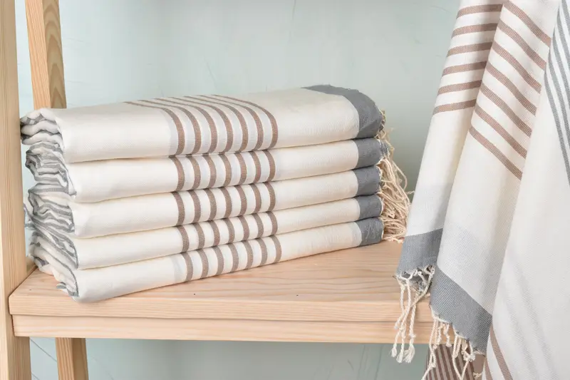 Dimensions are specified as 40x71 inches, with a weight tolerance due to their handmade nature. Pre-shrinking ensures consistent sizing after the first wash, maintaining the intended dimensions. Each towel is washed prior to the fi...