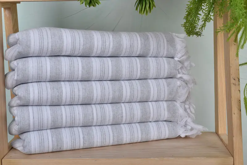 The towel is crafted from a blend of organic cotton and linen, characterized by its superior absorbency and durability. The dimensions of the towel are 70x40 inches, ensuring a comfortable size suitable for multiple uses. Weight is 200 grams, with possible variations of up to 1-2.5cm due to the hand-weaving process.