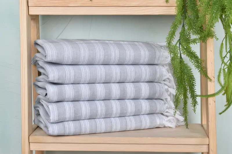 The product is characterized by a blend of organic cotton and linen, ensuring high absorbency and durability. Dimensions are precisely 40x71 inches, with a weight of 210 grams. Hand-weaving results in minor size variations within a tolerance of 1-2.5cm.