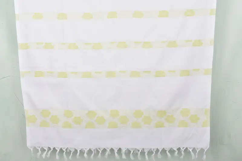 The Daisy Design Towel is composed of organic cotton and linen, ensuring a soft yet durable material. Characterized by a length of 40 inches and width of 71 inches, with a weight of 300 grams, the towel offers superior absorbency and comfort. Hand-woven with a tolerance of up to 1-2.5cm, each piece may exhibit slight variations.
