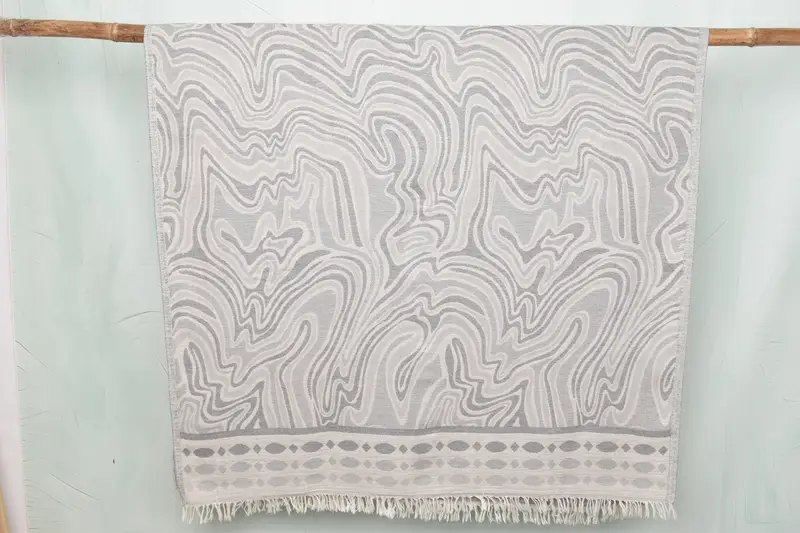 The bath towel is characterized by its fiber composition of organic cotton and linen, ensuring enhanced absorbency and durability. Measuring 40x71 inches and weighing 340 grams, the towel exhibits slight variations due to its hand-weaving process, with tolerances within 1-2.5 cm. Embroidery customization is available, allowing for personalization with names, initials, or logos, using various fonts and thread colors.