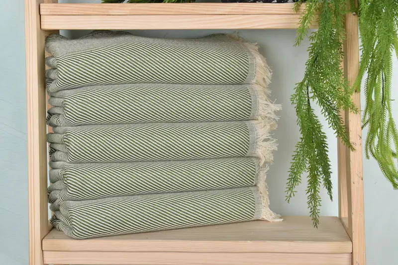Striped Towel is characterized by its organic cotton and linen composition, ensuring enhanced absorbency and durability. The towel measures 36x71 inches (91x180 cm) and weighs 350 grams, with dimensions potentially varying by 1-2.5 cm due to hand-weaving.