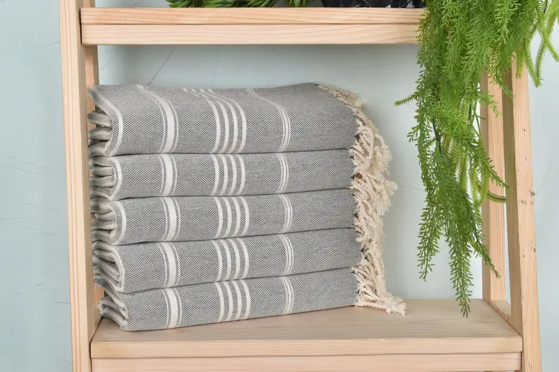 The Turkish Beach Towel is characterized by its organic cotton/linen fiber composition, ensuring enhanced breathability and superior absorbency. Dimensions are precisely 40x71 inches with a weight of 300 grams. Hand-weaving results in slight variations, with a tolerance of approximately 1-2.5cm.
