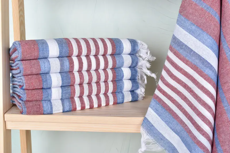 Characterized by organic cotton and linen blend, the towel ensures a high level of absorbency and durability. Measuring 40x67 inches and weighing 175 grams, it is intricately woven by hand, resulting in minor variations within a tolerance of 1-2.5 cm.