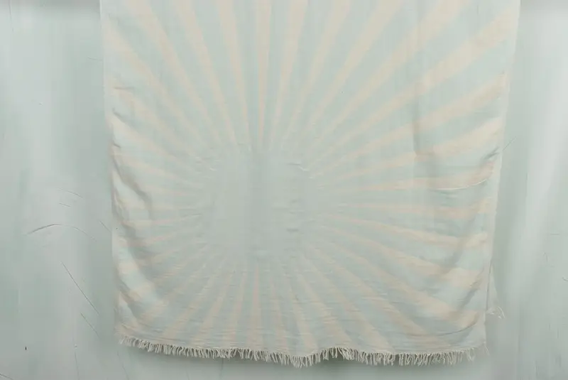 The Sun Design Towel, constructed from organic cotton and linen, is characterized by its superior absorbency and durability, ensuring an optimal performance. Dimensions of the towel are 70 inches in length and 36 inches in width, with a weight of 320 grams, presenting a slight variability due to hand-weaving. Each piece is carefully woven on a loom, resulting in a margin of tolerance of 1-2.5 centimeters in its dimensions.