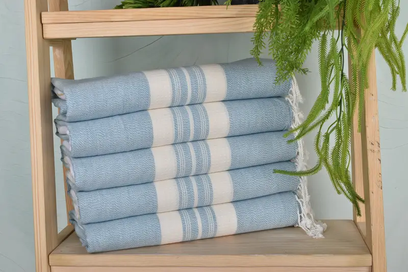 Organic cotton ensures high durability and environmental friendliness, resulting in a sustainable choice for the consumer. Characterized by a striped design, these towels measure 38x60 inches with a slight variation due to hand-weaving, and weigh 250 grams. Pre-shrunk and suitable for air or dryer drying, these towels offer customization through embroidery of names, initials, or logos.