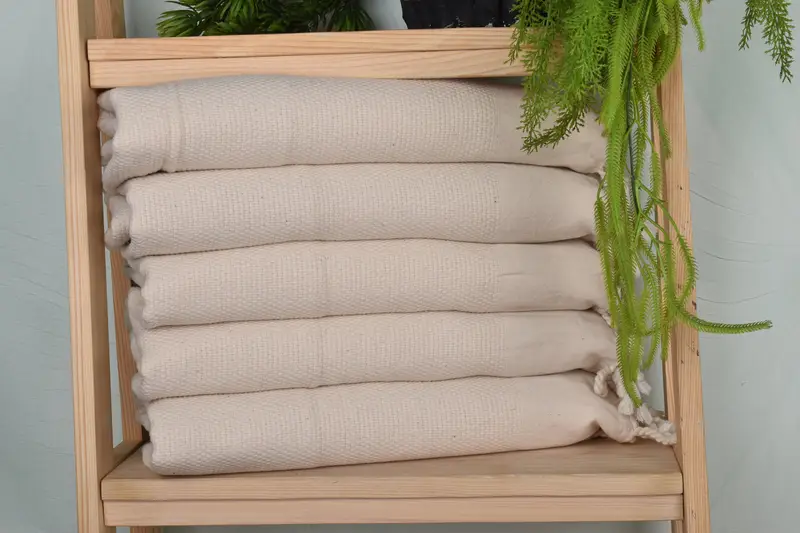 The hand towels are characterized by their natural cotton fabric, ensuring optimal breathability and durability. Dimensioned at 44 x 24 inches, these towels weigh approximately 150 grams, contributing to their lightweight nature. Weaving tolerances may result in slight variations of 1-2.5 cm in dimensions due to the handmade process.