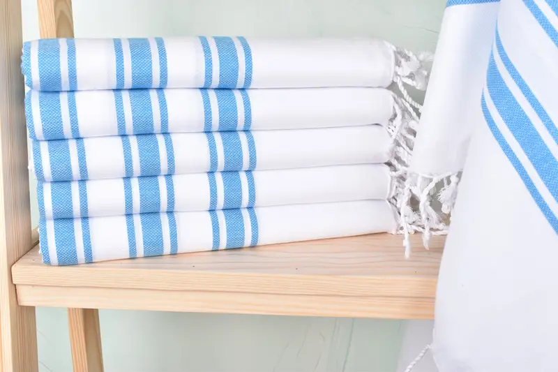 The towels are characterized by their organic cotton and linen fiber composition, ensuring high absorbency and durability. Resulting in a lightweight yet robust product, each towel measures 40x71 inches and weighs 280 grams. Tolerance in handmade dimensions may occur by up to 1-2.5cm due to the manual weaving process.