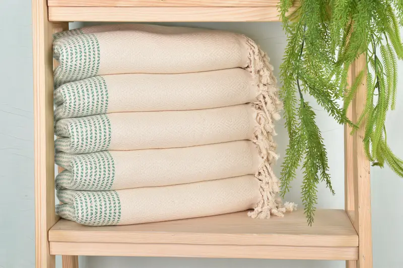 Organic cotton/linen blend characterizes the towel, ensuring high absorbency and durability. Measuring 40x70 inches, it weighs 450 grams, with slight variations due to its hand-weaving process. The towels are pre-shrunk and should be washed before first use.