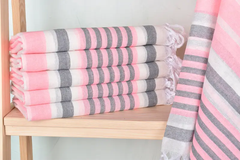 The Turkish Beach Towel is composed of organic cotton and linen, ensuring exceptional absorbency and durability. Characterized by a sub-category of beach towels, it spans 40x67 inches and weighs 175 grams. The dimensions may vary slightly due to the hand-weaving process, with a tolerance of approximately 1-2.5 cm.
