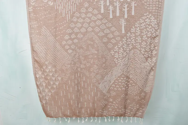Organic cotton and linen fibers ensure the Turkish beach towel offers high absorbency and durability. Comprising of 36x67 inches, the towel weighs 260 grams, with a slight variation due to hand-weaving techniques. Each towel is pre-washed and ready for use, maintaining a consistent quality.