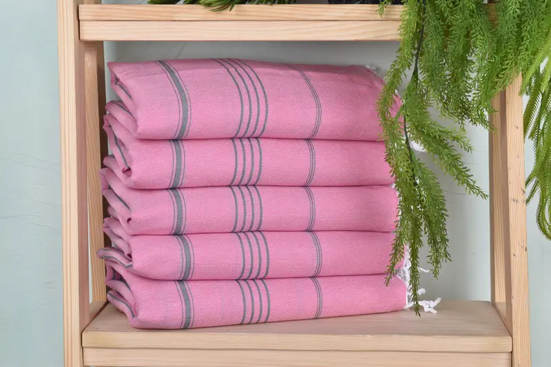 The towels are characterized by their composition of organic cotton and linen, ensuring high absorbency and durability. Each towel measures 40x71 inches, weighing 280 grams, with potential variations of up to 2.5 cm due to the hand-weaving process.