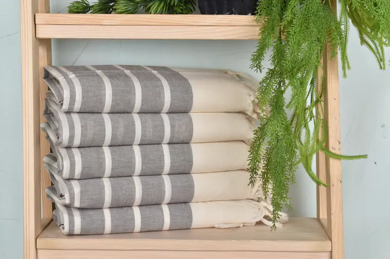 Striped Towels are characterized by their intricate weave, typically employing organic cotton and linen fibers, ensuring a high-quality texture and absorbency suitable for beach use. Measuring 40x71 inches and weighing 200 grams, these towels result in a lightweight yet durable product. Tolerances in size and weight may occur due to the hand-weaving process, allowing for a maximum variation of 1-2.5cm.