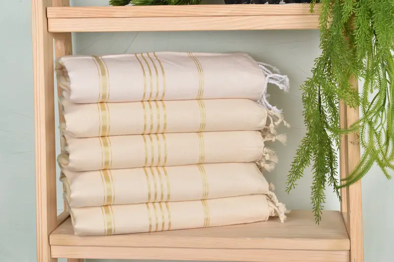The 40x71 inches cream-flush yellow cotton towel is characterized by its organic cotton and linen blend, ensuring durability and softness. The towel's dimensions are precise at 40x71 inches and weighing 280 grams, with slight variations in handmade pieces, typically within a 1-2.5cm tolerance. Customization options include embroidery with names, initials, or logos, following pre-established guidelines for font selection and placement.
