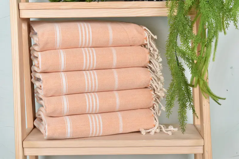 Organic cotton/linen fiber composition ensures high absorbency and comfort, characterized by its breathable nature. Dimensions measure 40x67 inches with a weight of 330 grams, allowing for slight variations of 1-2.5 cm due to the hand-weaving process. Customization options include embroidery of names, initials, or logos, with pre-washed towels to prevent shrinkage.