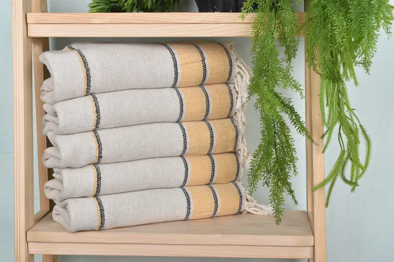 The bath towel is characterized by its composition of organic cotton and linen, ensuring both softness and durability. Measuring precisely 36 by 71 inches with a weight of 430 grams, it offers substantial absorbency. Hand-weaving results in minor dimensional tolerances of up to 1-2.5 cm.