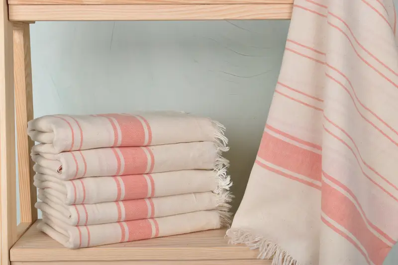 Organic cotton and linen characterize the composition of these Turkish towels, ensuring softness and high absorbency. Each towel measures precisely 36x67 inches and weighs 180 grams, with hand-weaving variations of up to 1-2.5cm. Handcrafted towels allow slight variations in size and weight.