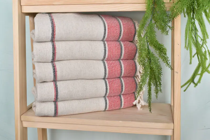 The towel is composed of organic cotton and linen, characterized by excellent absorbency. Dimensions are 36x71 inches with a weight of 430 grams. Hand-weaving results in slight variations up to 1-2.5cm.