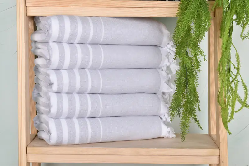 The towels are characterized by their organic cotton and linen blend, ensuring breathability and robust absorbency. Measuring 70x36 inches and weighing 400 grams, each piece is meticulously woven by hand, resulting in slight variations of up to 2.5 cm due to the artisanal nature of the product. Customization options include embroidery of names, initials, or logos, with specific requests such as font and placement to be communicated prior to processing.