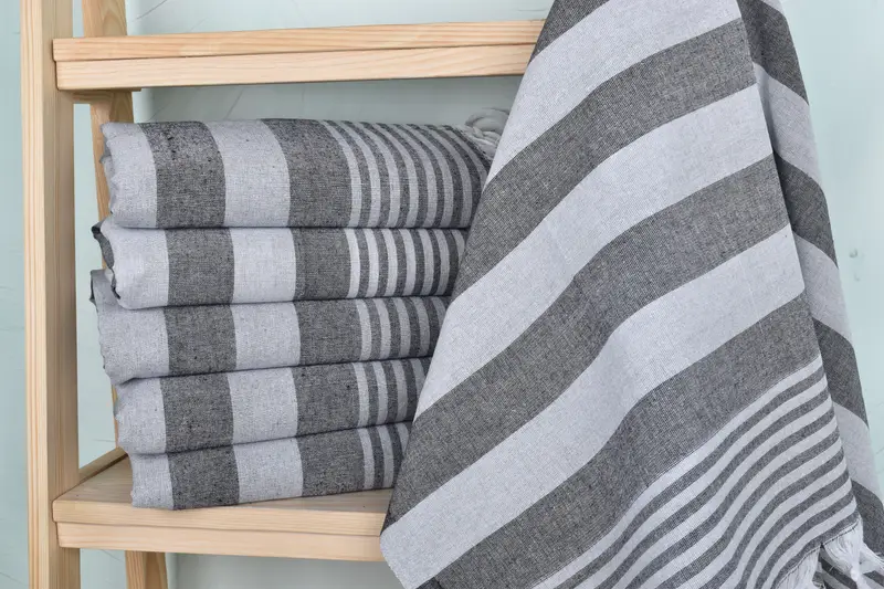 Organic cotton and linen composition ensures high absorbency and durability. Characterized by dimensions of 36x67 inches and a weight of 200 grams, this product can exhibit slight variations due to the hand-weaving process, typically within 1-2.5cm. Embroidery customization is available for names, initials, or logos, with font and color selections offered. Pre-shrunk status before first use allows for flexible washing and drying options. Orders are shipped within a day via DHL Express or FedEx, with international orders handled from Turkey.