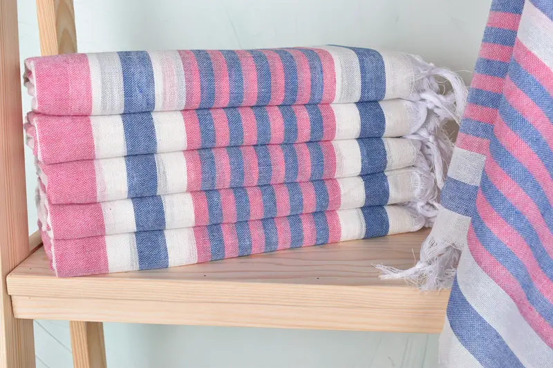 Characterized by its durable organic cotton and linen blend, the custom beach towel ensures superior absorbency and breathability. Measuring 40x67 inches, the weight is approximately 175 grams, with variations of up to 2.5 cm due to hand-weaving.