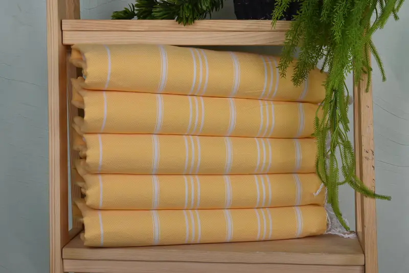 The hand towels are produced using organic cotton and linen fibers, ensuring high absorbency and durability. Characterized by a hand-weaving process, the dimensions are 40x24 inches, weighing 100 grams. Tolerances in size and weight may occur due to their handmade nature.
