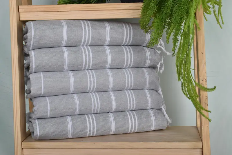 The 24"x40" light gray cotton hand towel is composed of organic cotton and linen, ensuring a blend of softness and durability. Characterized by its dimensions of 40 inches by 24 inches and a weight of 100 grams, the towel's size may vary slightly due to the handmade nature of the product, with a tolerance of up to 1-2.5 centimeters. The cotton towels are pre-shrunk, ensuring they maintain their shape post-washing.