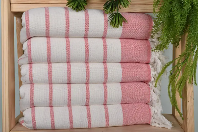 The 18"x36" hand towel is characterized by its organic cotton and linen material, ensuring high absorbency and durability. Resulting in a product weighing 120 grams, dimensions are precisely 36x18 inches with slight variations due to hand-weaving. Each piece is meticulously crafted, resulting in a lightweight and comfortable towel.