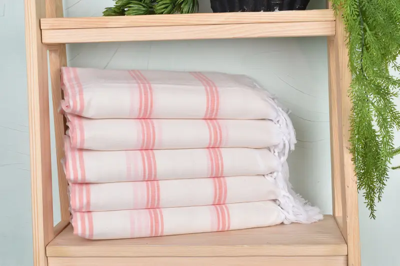 Characterized by an organic cotton and linen blend, the 40x71 inches coral cotton towel ensures absorbency and durability. Resulting in a weight of 310 grams, the towel's size and weight may vary slightly due to its handmade nature. Towels exhibit a pre-washed status, with guidelines for washing at 30 degrees and drying using an air dryer or conventional dryer.