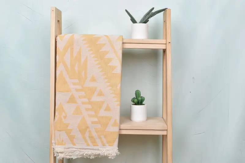 Organic cotton and linen composition characterizes the towel, ensuring high absorbency and durability. The towel's dimensions are 40x75 inches with a weight of 330 grams, and the size may vary by 1-2.5 cm due to hand-weaving. Embroidered personalization options are available, allowing for names, initials, or logos, with attention to pre-shrinking and washing instructions.