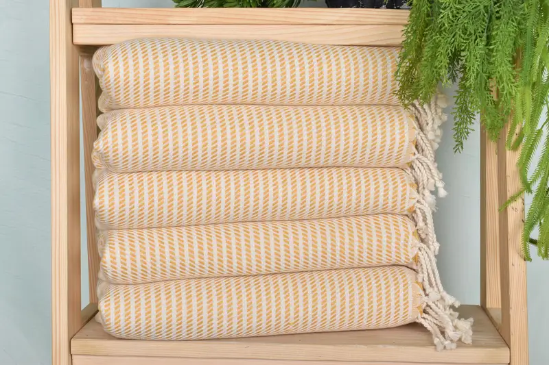 The hand towels are characterized by their organic and recycled cotton composition, ensuring both sustainability and durability. Each towel measures 40x20 inches, with a weight of 122 grams, and the size may vary slightly due to the hand-weaving process. Customers can expect a tolerance of up to 1-2.5cm in dimensions.