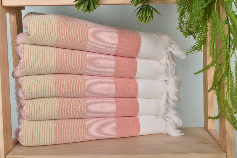 The towels are composed of organic cotton and linen, ensuring durability and a soft texture. Characterized by their dimensions of 67 inches in length and 40 inches in width, they have a weight of 260 grams, with minor variations possible due to hand-weaving techniques. The towels are pre-shrunk and can be washed at 30 degrees with 600 cycles.