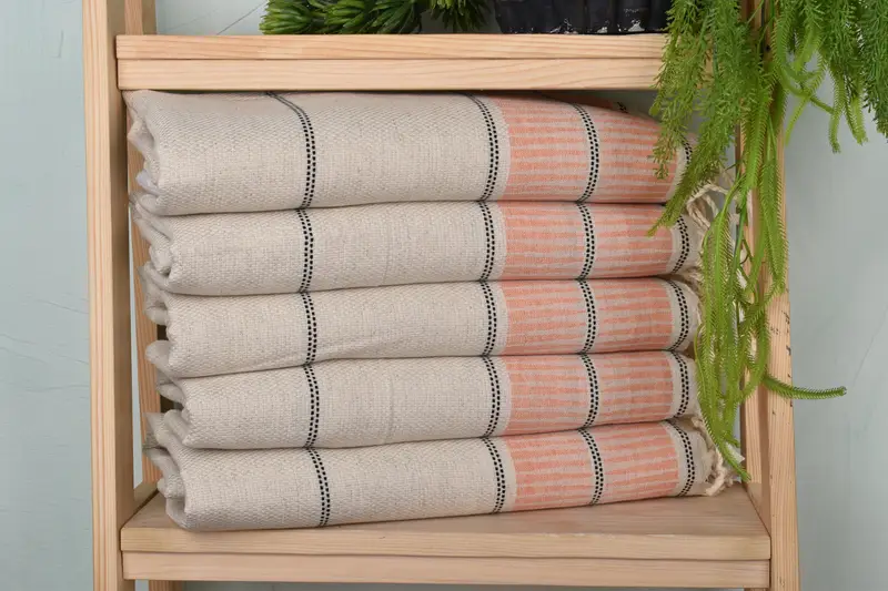 The hand towels are characterized by a material composition of organic cotton and linen, ensuring breathability and durability. Each piece measures 40 inches in length and 20 inches in width, with a weight of 120 grams. Hand-weaving results in minor variations in size and weight, typically within a range of 1-2.5 centimeters.