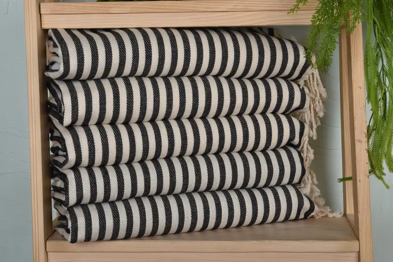 The dish towel is constructed from a blend of organic and recycled cotton, ensuring enhanced sustainability and reduced environmental impact. Resulting in a product characterized by superior strength and longevity. The towel's dimensions are specified as 40x18 inches, equating to approximately 101.6x45.72 centimeters. The weight of the towel is 100 grams, and hand-weaving tolerances allow for slight variations of 1-2.5 centimeters.