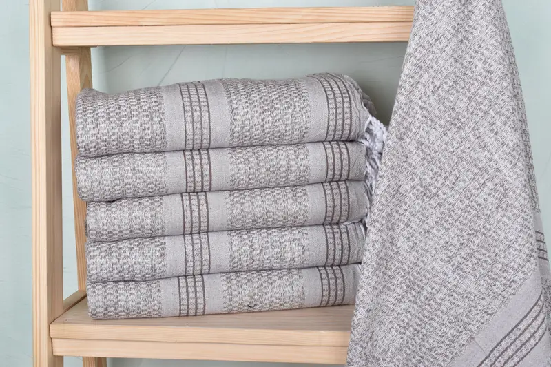 Constructed from a blend of organic cotton and linen, ensuring optimal absorbency and durability, these towels are meticulously woven by hand on a loom, resulting in slight variations in size and weight. Characterized by their 36x71 inches dimensions and a weight of 340 grams, each towel allows for a small tolerance of 1-2.5cm due to the handmade nature.