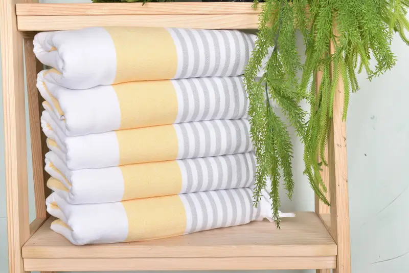 Organic cotton/linen towels ensuring superior absorbency and durability. Characterized by a length of 67 inches and width of 36 inches, these towels weigh approximately 400 grams. Hand-woven with tolerance of up to 2.5cm in dimensions.
