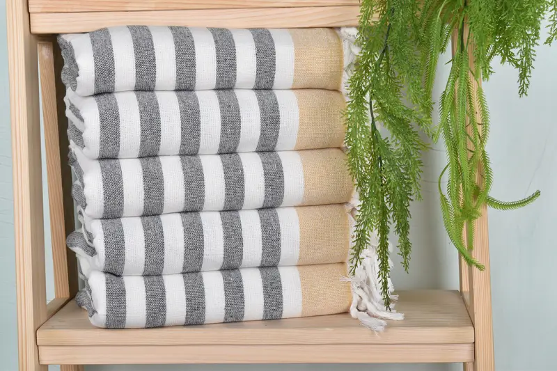 The towel is composed of organic cotton and linen, ensuring a breathable and comfortable feel. Resulting in a weight of 422 grams, it measures 40x67 inches, with handmade weaving producing a tolerance of approximately 1-2.5cm.