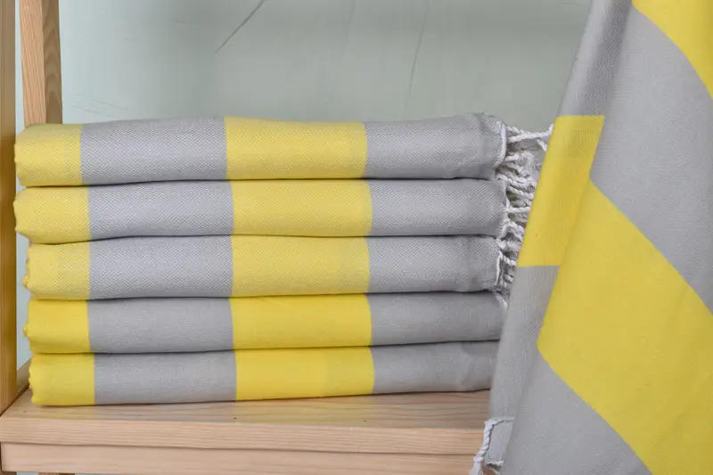 These beach towels are composed of organic cotton and linen, ensuring durability and high absorbency. Characterized by their 40x71 inches dimensions and a weight of 290 grams, they exhibit slight variations due to their hand-weaving process, within a tolerance of 1-2.5cm.